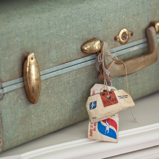 I discovered this vintage turquoise suitcase at a antique craft fair for $12 and was waiting to find the perfect place for it... I think it will now have a home in almost every holiday setup I create... The "Fall in Love" sign was in my fall bin from the year before (a HomeGoods find for $6 on clearance from the previous year). The floral arrangements included a few different faux stems from Michaels. The basket was another fun find at Michaels for 70% off.